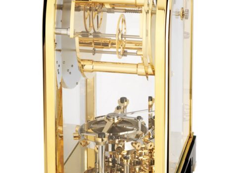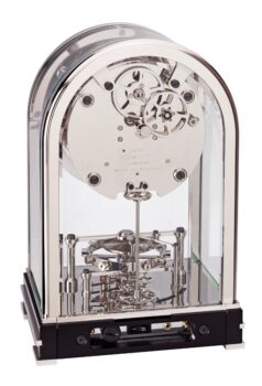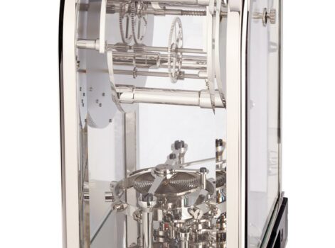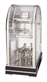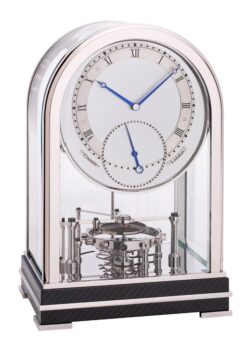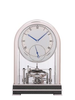 Der Aufzug dieser ansonsten rein mechanischen Tischuhr erfolgt unsichtbar elektrisch. Ein integrierter Motor spannt die Aufzugsfeder. Der Akku-Ladezyklus beträgt mehr als ein Jahr. Wir zeigen im Geschäft die Ausführung Rhodium/ Carbon.