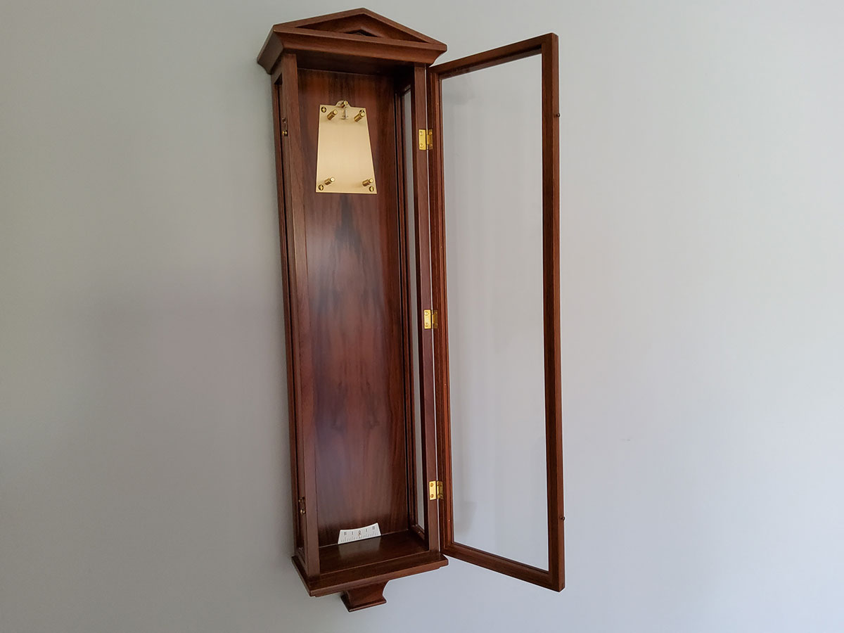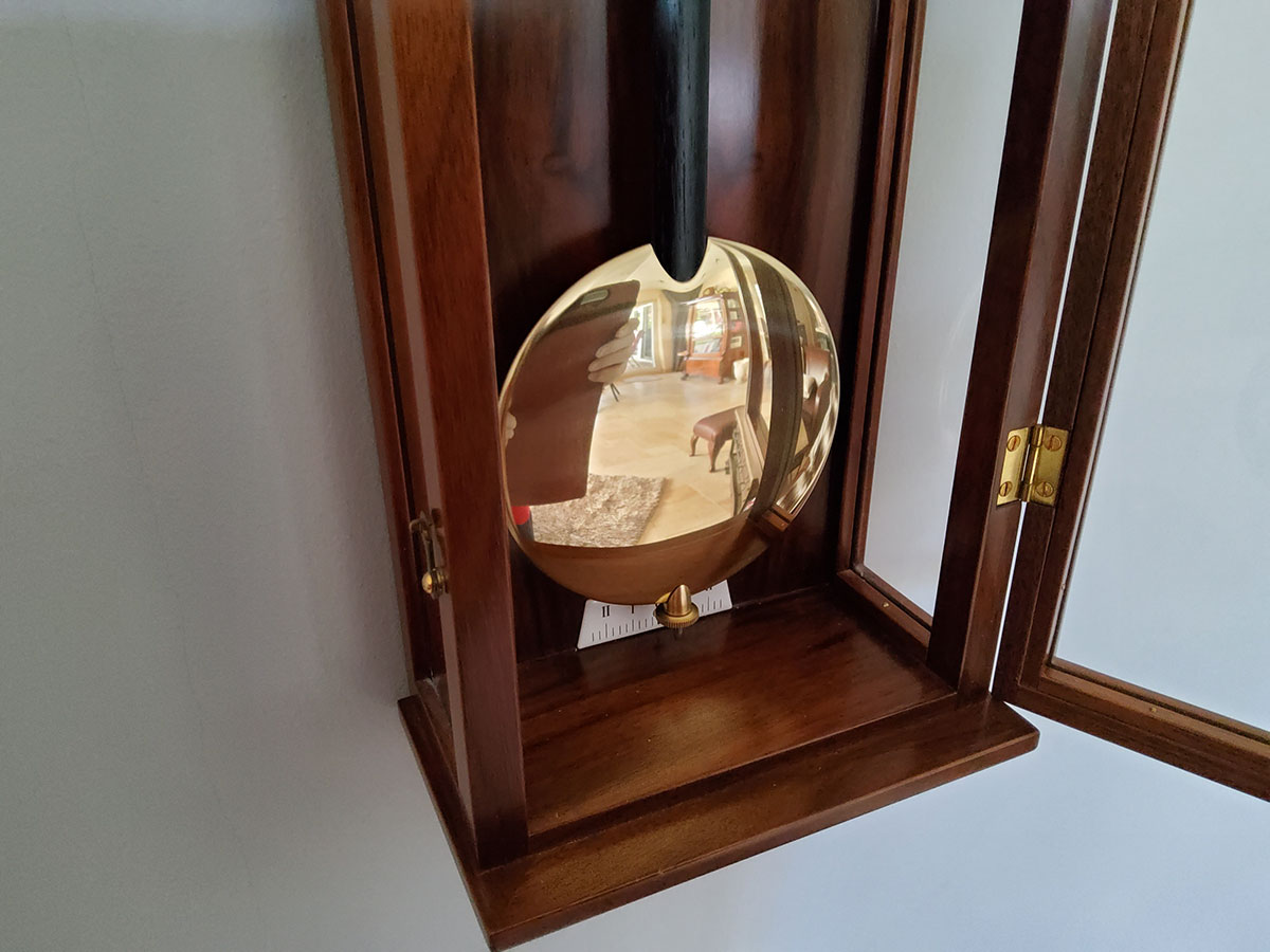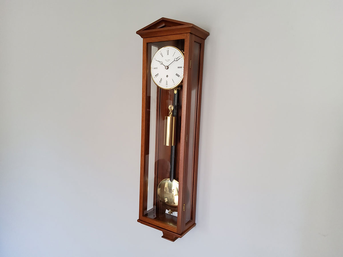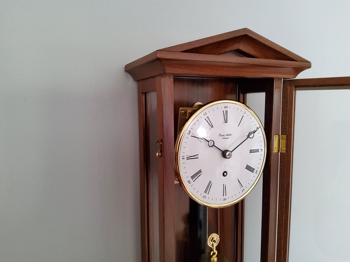 Das feine Erwin Sattler Kaliber 1300 ermöglicht die kleinsten durch Gewicht angetriebenen Uhren weltweit. Diese neuwertige 1310 in massiv Nussbaum ist zwar 20 Jahre alt, aber im Originalkarton lagernd. Nach unserer Kenntnis und augenscheinlich unbenutzt. Im Mai 2025 wurde das Werk in einer zertifizierten Sattlerwerkstatt prophylaktisch zerlegt und gereinigt, denn Sauberkeit und Öl sind die besten Freunde mechanischer Uhren. Keinerlei Gebrauchsspuren – Bestnote für den Zustand aller Komponenten.
