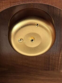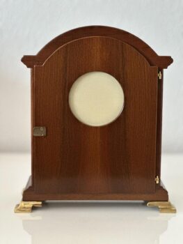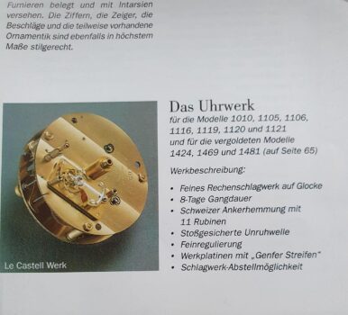 Das feine Le Castell- Werk tickt dezent; der Halbstundenschlag auf eine Glocke, die gleichzeitig das Werk kapselt, ist mit einem Handgriff abstellbar. Obwohl ohne Beanstandungen, wurde das Uhrwerk komplett zerlegt und gereinigt; der Verkauf erfolgt mit voller Garantie.