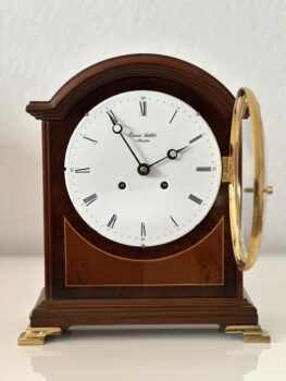 Handgefräste gebläute Zeiger und ein Emailleziffernblatt passen gut zum Nussbaumgehäuse mit Einlegearbeit aus Eibe mit Buchsbaumintarsie. Die Uhr ist 24 cm hoch, 19 cm breit und nur 9 cm tief, was selten ist und fast jeden Aufstellungsort möglich macht.